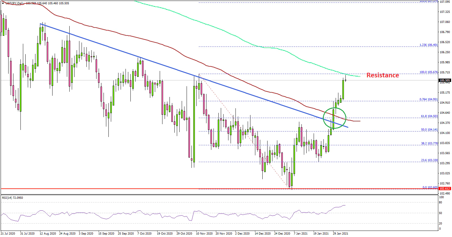 Any more upsides may open the doors for a larger increase above the 106.00 and 106.20 resistance levels. If there is a downside correction, the previous resistance near 104.50 and the 100-day simple moving average (red) could provide support.
