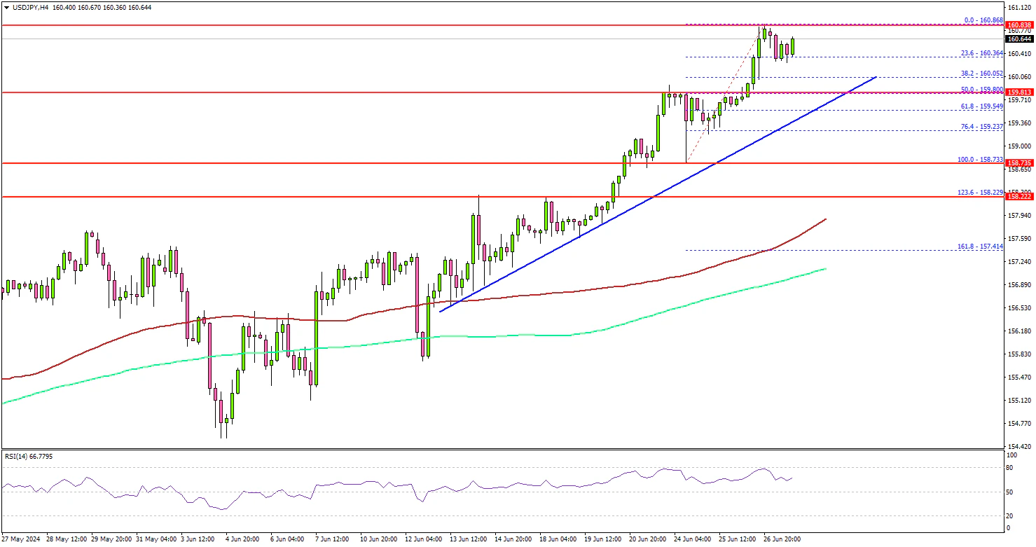 The US Dollar remained in a strong uptrend above the 157.50 level against the Japanese Yen. USD/JPY cleared the 160.00 resistance to move further into a positive zone.