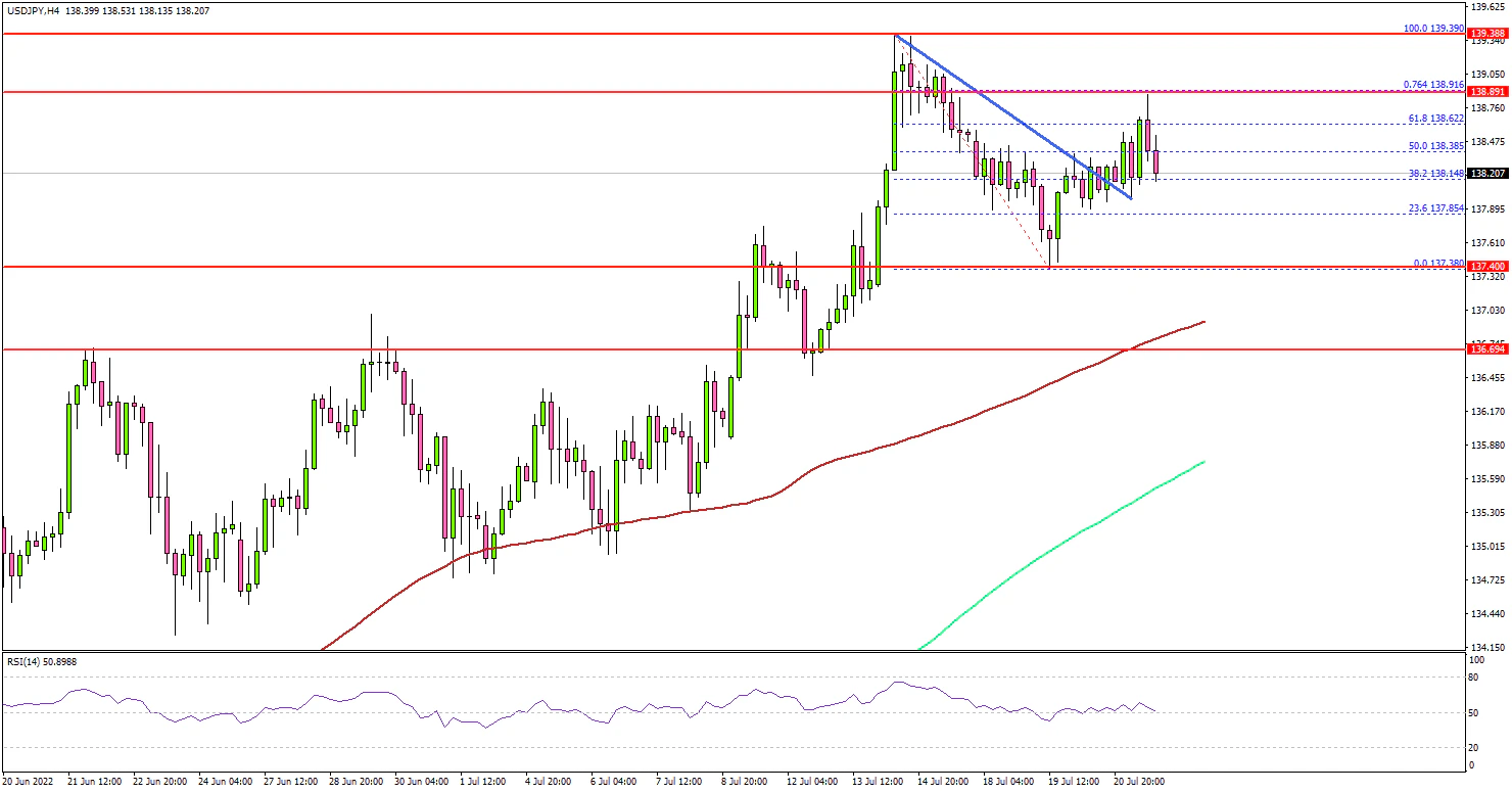 - It is facing resistance near 138.80 and 139.00 on the 4-hours chart.