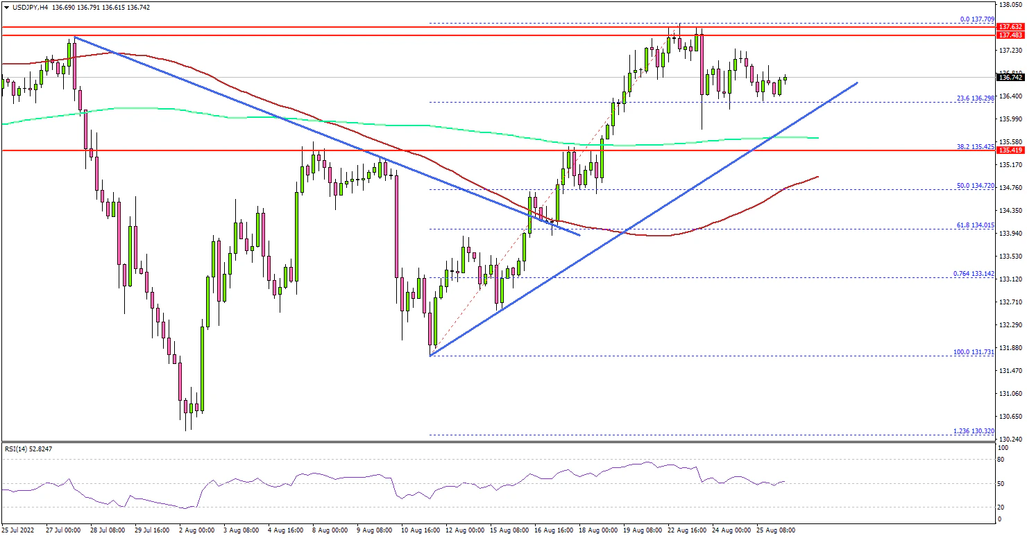 Recently, there was a downside correction below the 137.20 level. The pair even dipped below 136.00, but downsides were limited. The pair stayed well above the 135.50 support and the 200 simple moving average (green, 4-hours).