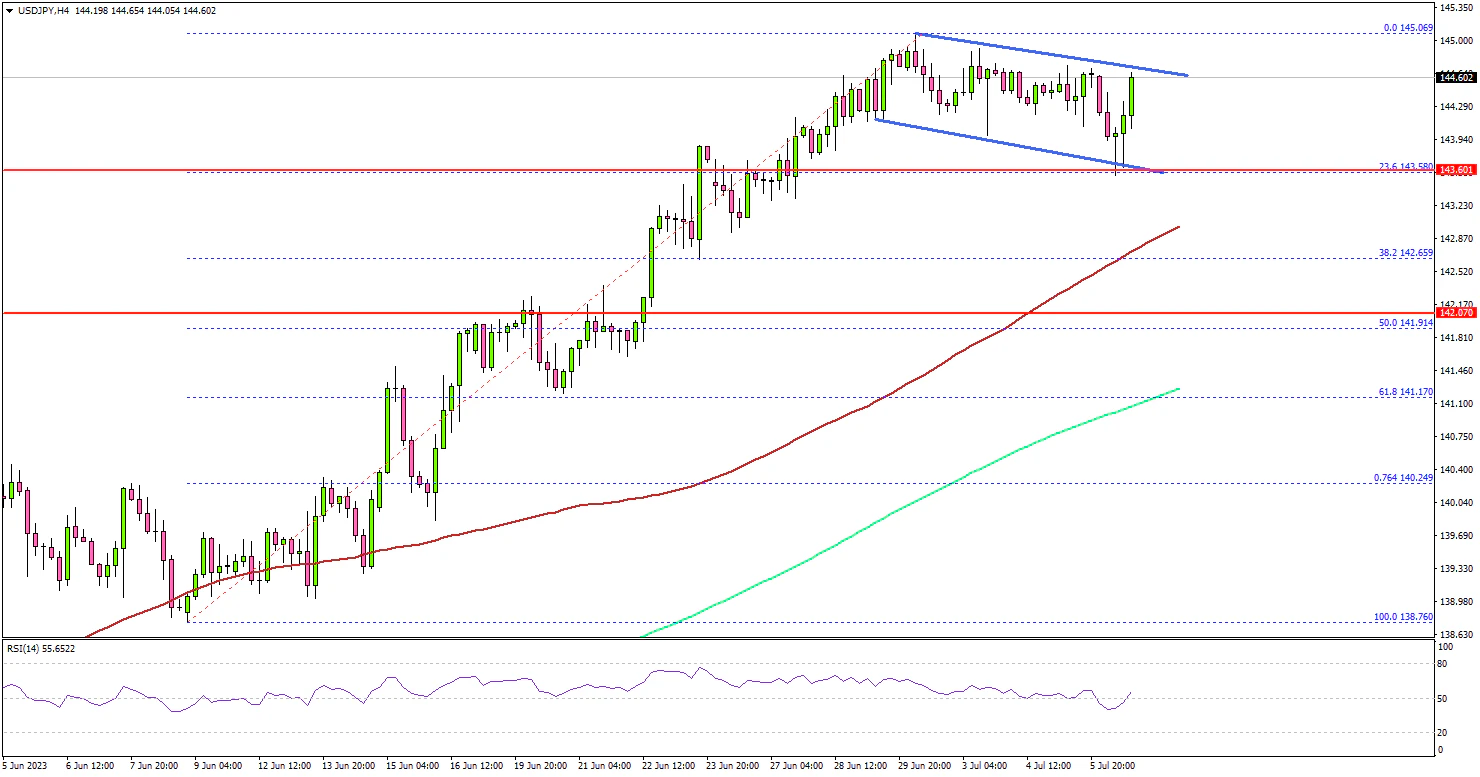 The US Dollar started a downside correction from 145.00 against the Japanese Yen. USD/JPY tested the 143.50 zone and recently started a fresh increase.