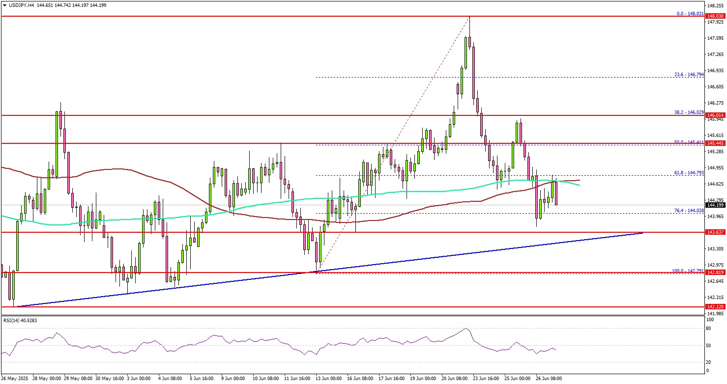 Any more losses could send the pair toward the 142.80 support zone. If the bulls remain active above the stated support levels, there could be a fresh increase. On the upside, the pair could face resistance near the 145.00 level.