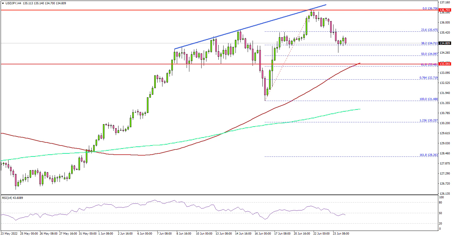 The pair is now correcting gains and trading below 135.50. There was a move below the 38.2% Fib retracement level of the recent rally from the 131.48 swing low to 136.70 high.