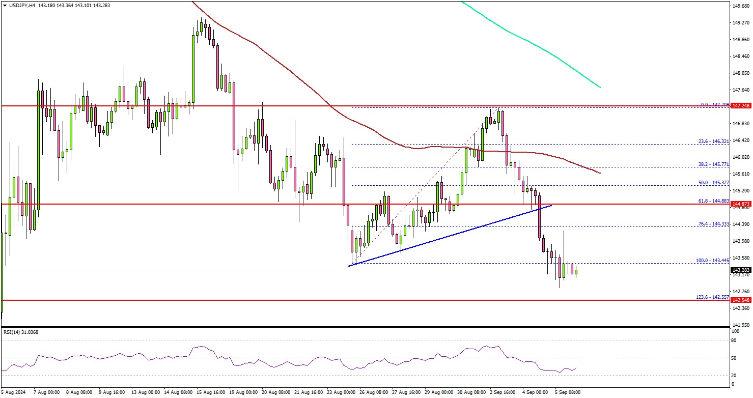 The pair is now trading well below the 100 simple moving average (red, 4-hour) and the 200 simple moving average (green, 4-hour). On the downside, immediate support sits near the 143.00 level.