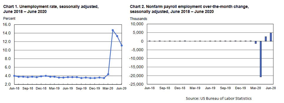 - The US nonfarm payrolls increased 4,800K in June 2020, more than the 3,000K forecast.