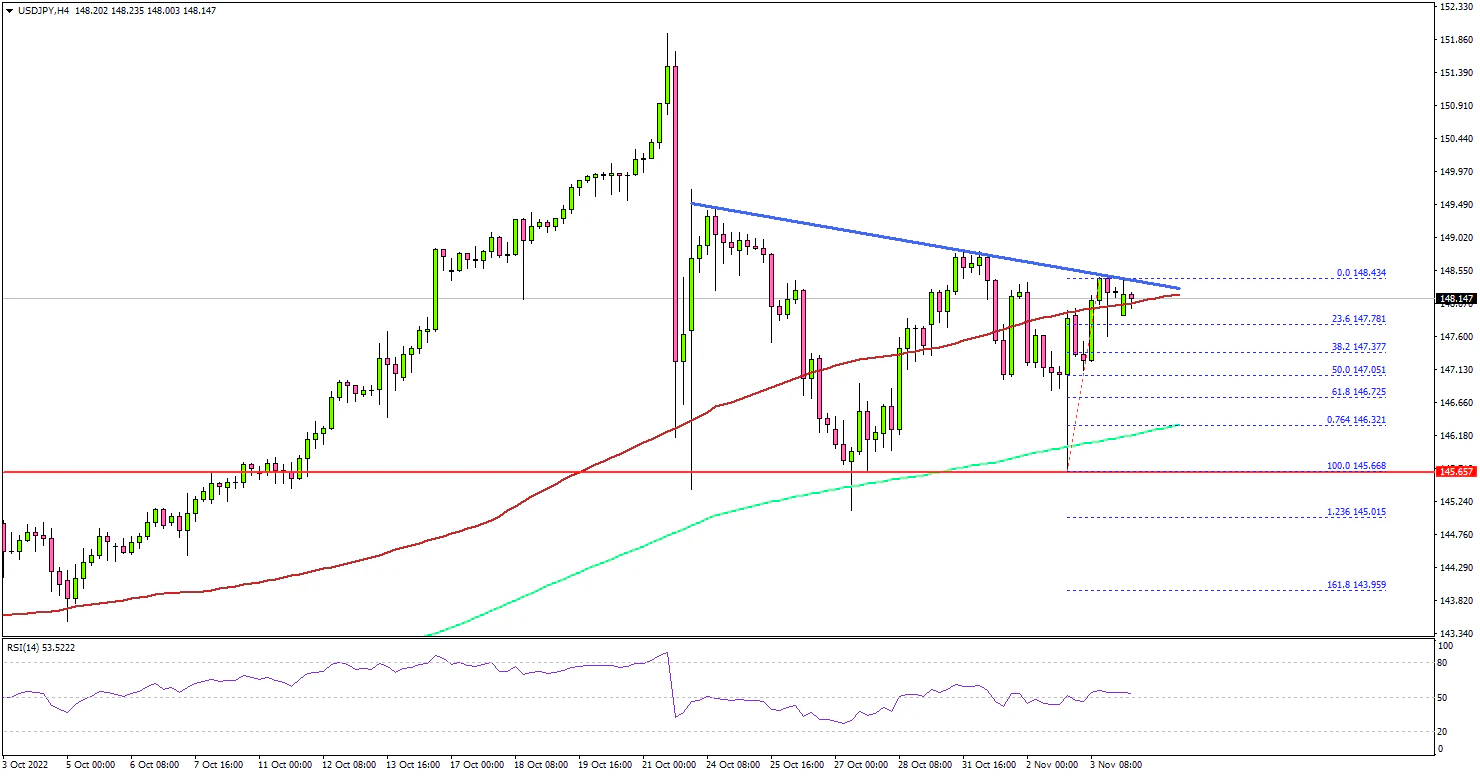- USD/JPY is facing resistance near 148.50 and 149.00.