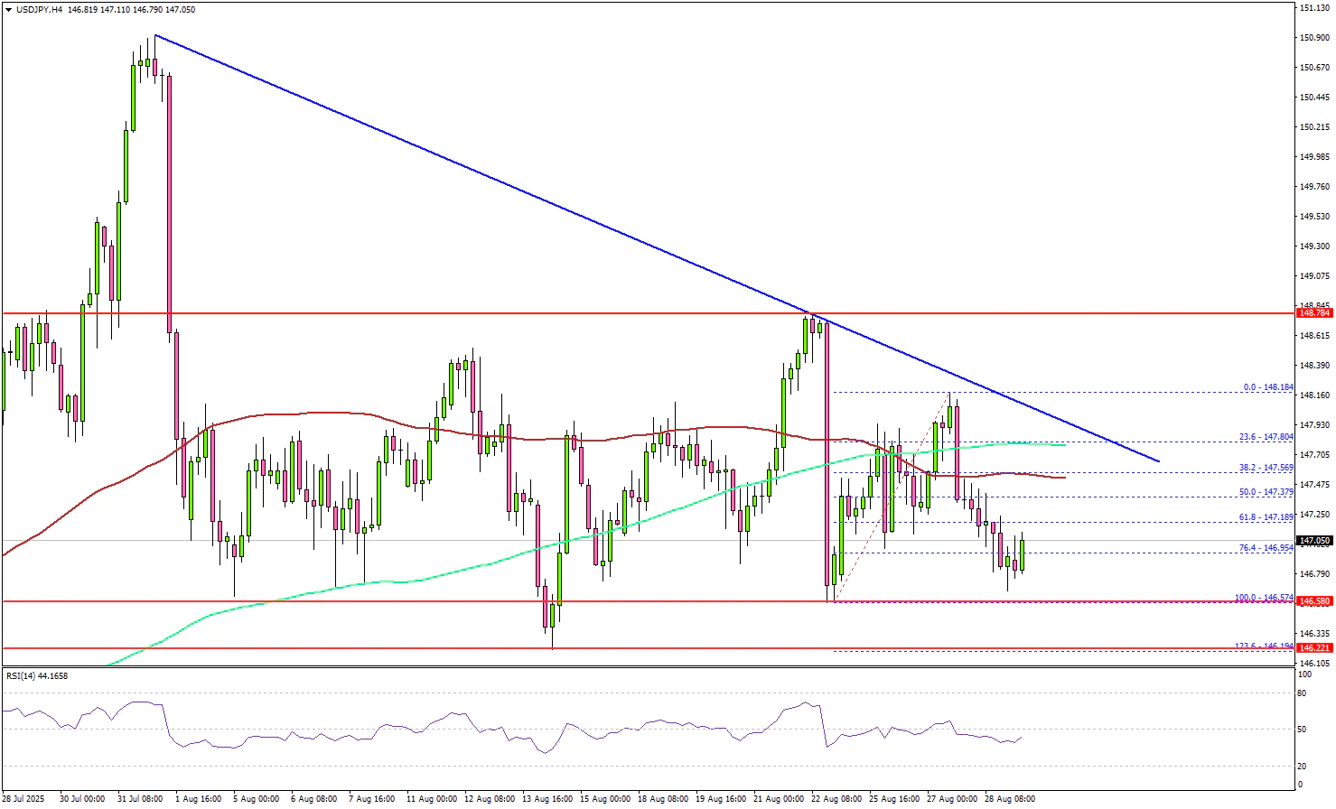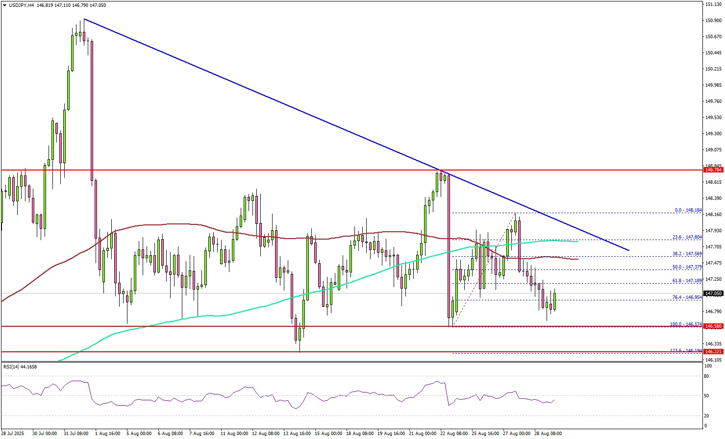 The current price action is bearish below the 61.8% Fib retracement level. On the downside, immediate support is 146.60. The next key support sits at 146.20. Any more losses could send the pair toward the 145.50 support zone.