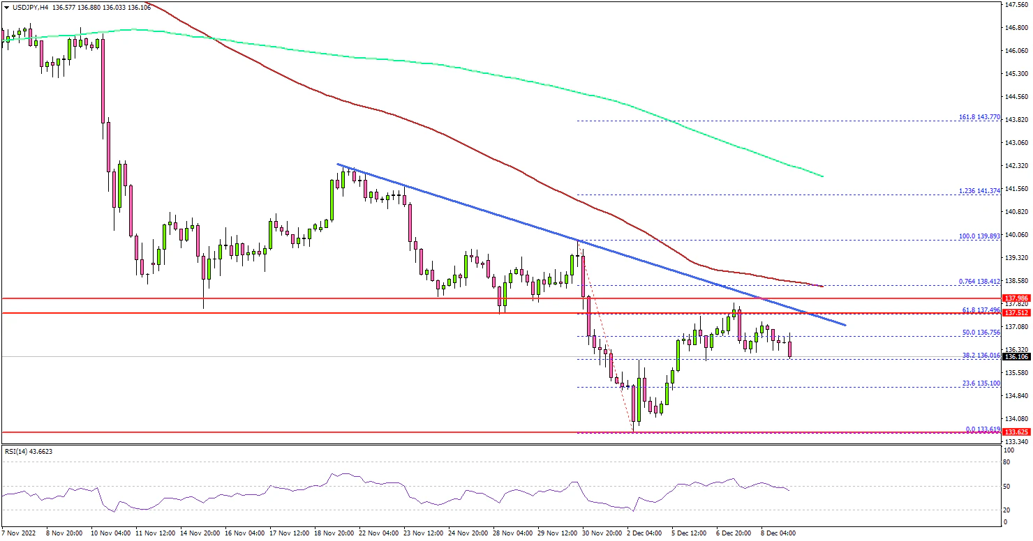 Looking at the 4-hours chart, the pair corrected above the 135.00 resistance zone. There was a move above the 50% Fib retracement level of the downward move from the 139.89 swing high to 133.61 low.