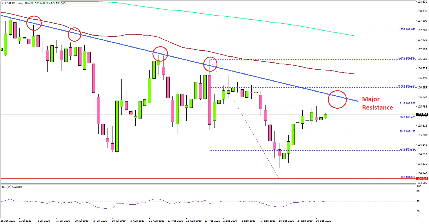 If the pair struggles to continue higher above 106.00 or 106.20, there is a risk of a fresh decline. An initial support on the downside is near the 105.10 and 105.00 levels, below which the pair could revisit the 104.00 support level.