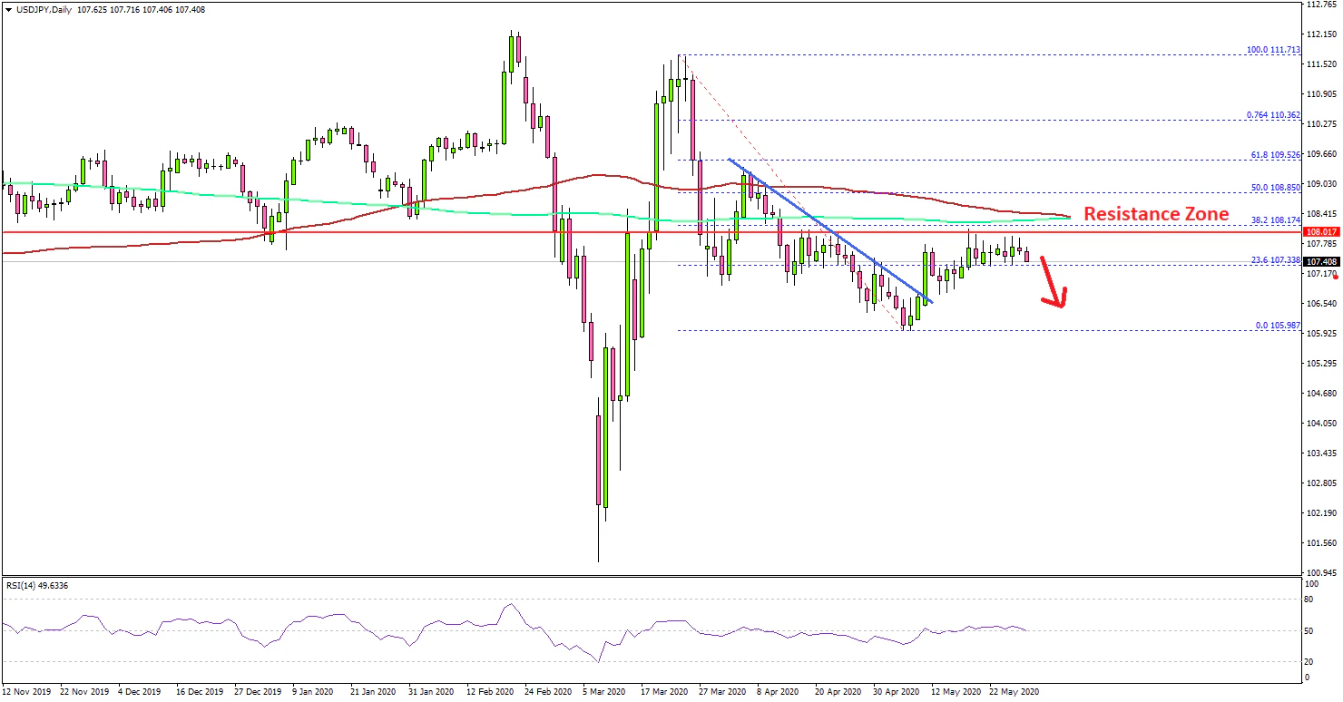 - USD/JPY is facing a crucial resistance near the 108.20 and 108.50 levels.