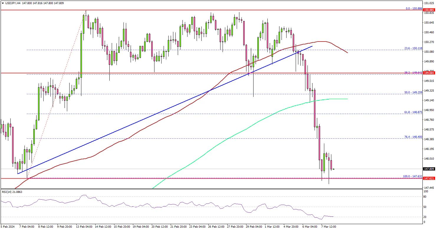 The bears took control and dumped the pair below the 148.80 support zone. There was a clear move below the 76.4% Fib retracement level of the upward move from the 147.63 swing low to the 150.88 high.