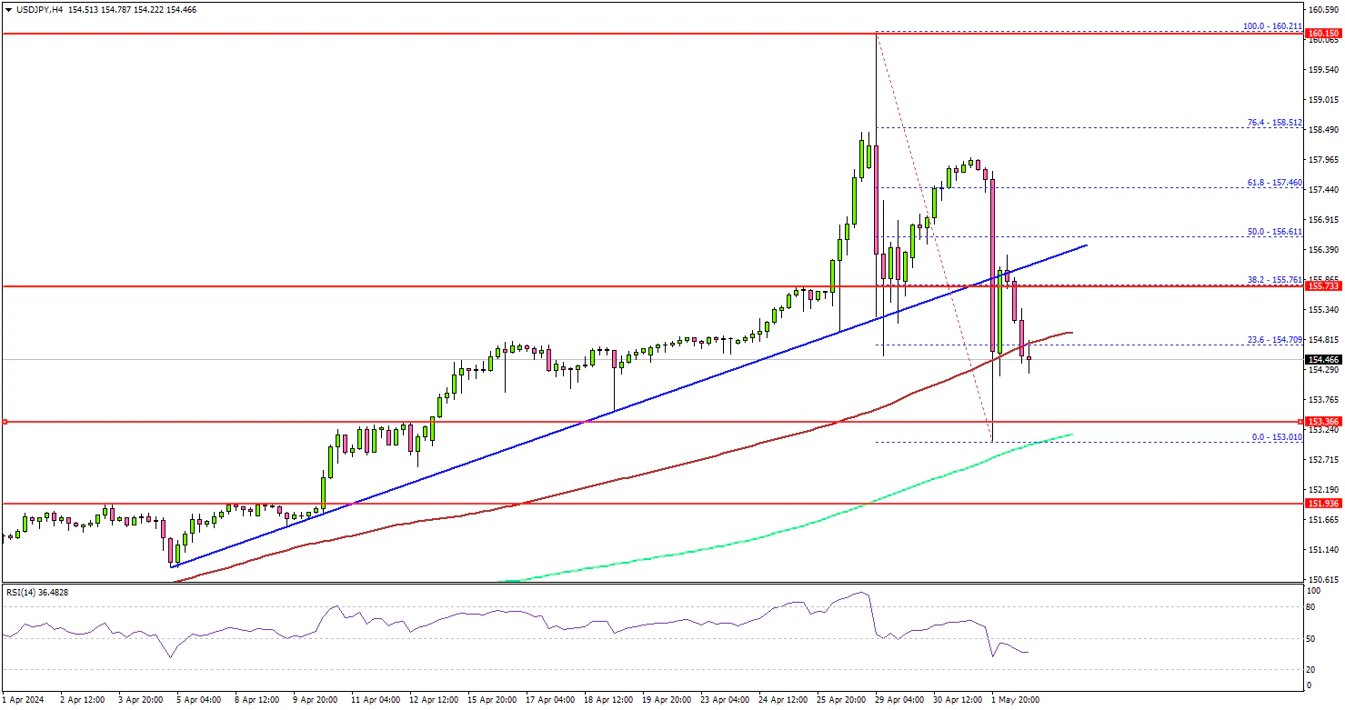 The US Dollar climbed higher above the 155.00 resistance zone against the Japanese Yen. USD/JPY traded to a record high at 160.21 before there was a sharp decline.