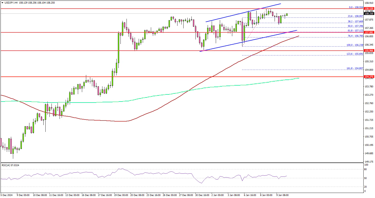 Looking at the 4-hour chart, the pair settled above the 157.00 level, the 100 simple moving average (red, 4-hour), and the 200 simple moving average (green, 4-hour). The pair tested the 158.50 zone and traded as high as 158.55.