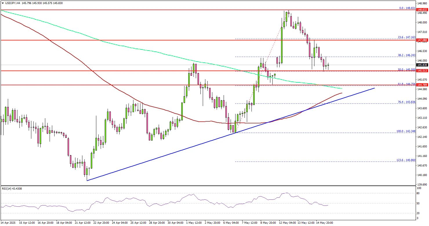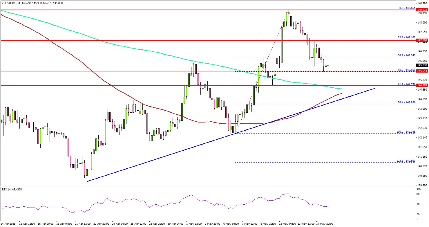 On the downside, immediate support sits near the 144.75 level and the 200 simple moving average (green, 4-hour). The next key support sits near 144.50. There is also a connecting bullish trend line forming with support at 144.50 on the same chart.