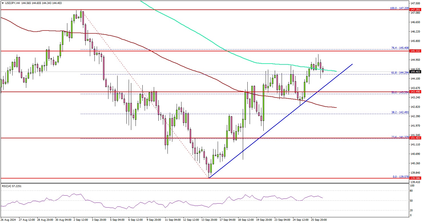 On the downside, immediate support sits near the 144.20 level. There is also a key bullish trend line forming with support at 144.00 on the same chart, below which the pair might test 143.50.