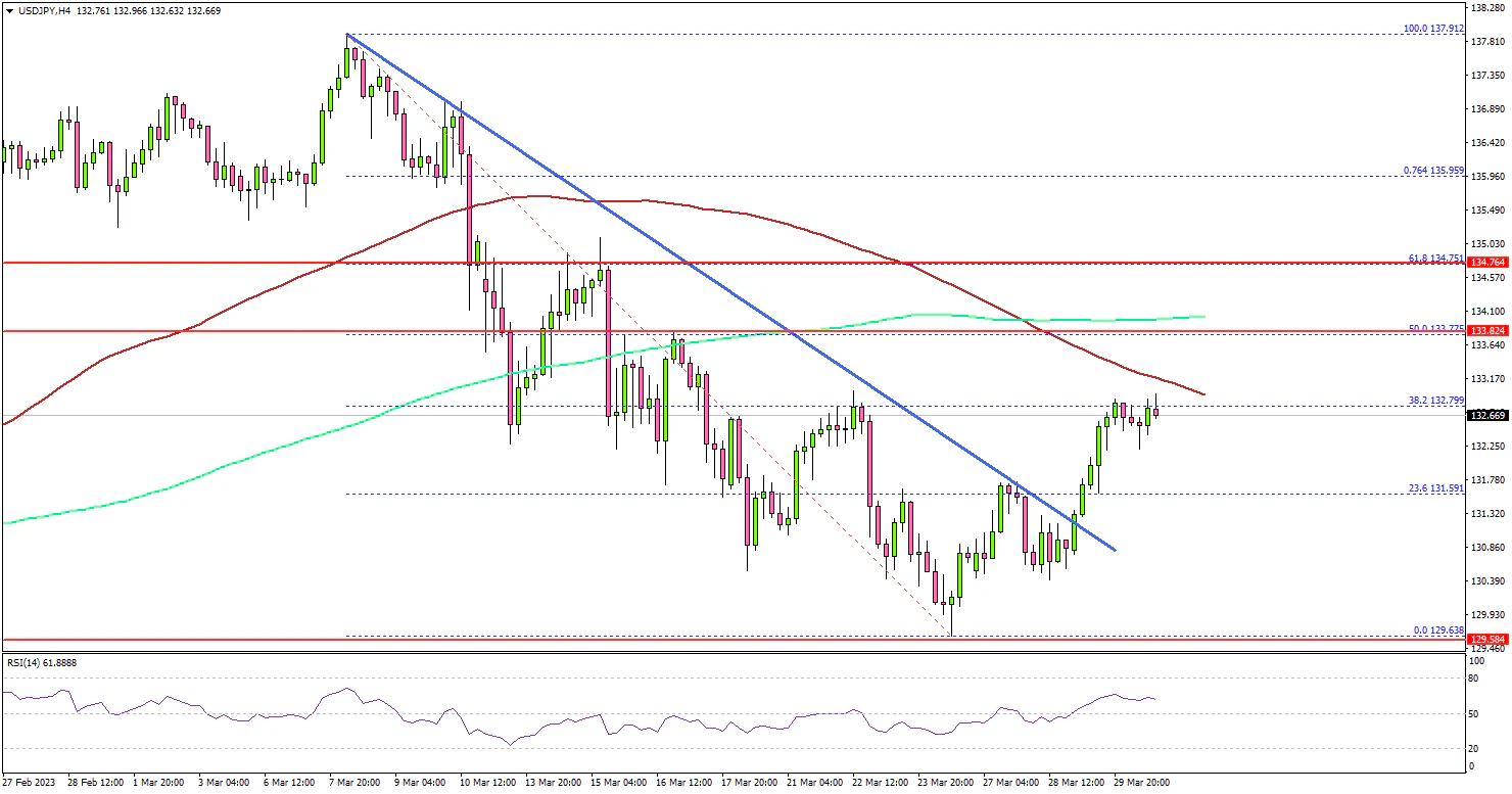 Looking at the 4-hours chart, the pair cleared a major bearish trend line with resistance near 131.20. The pair even tested the 132.80 resistance zone and traded close to the 100 simple moving average (red, 4-hours).