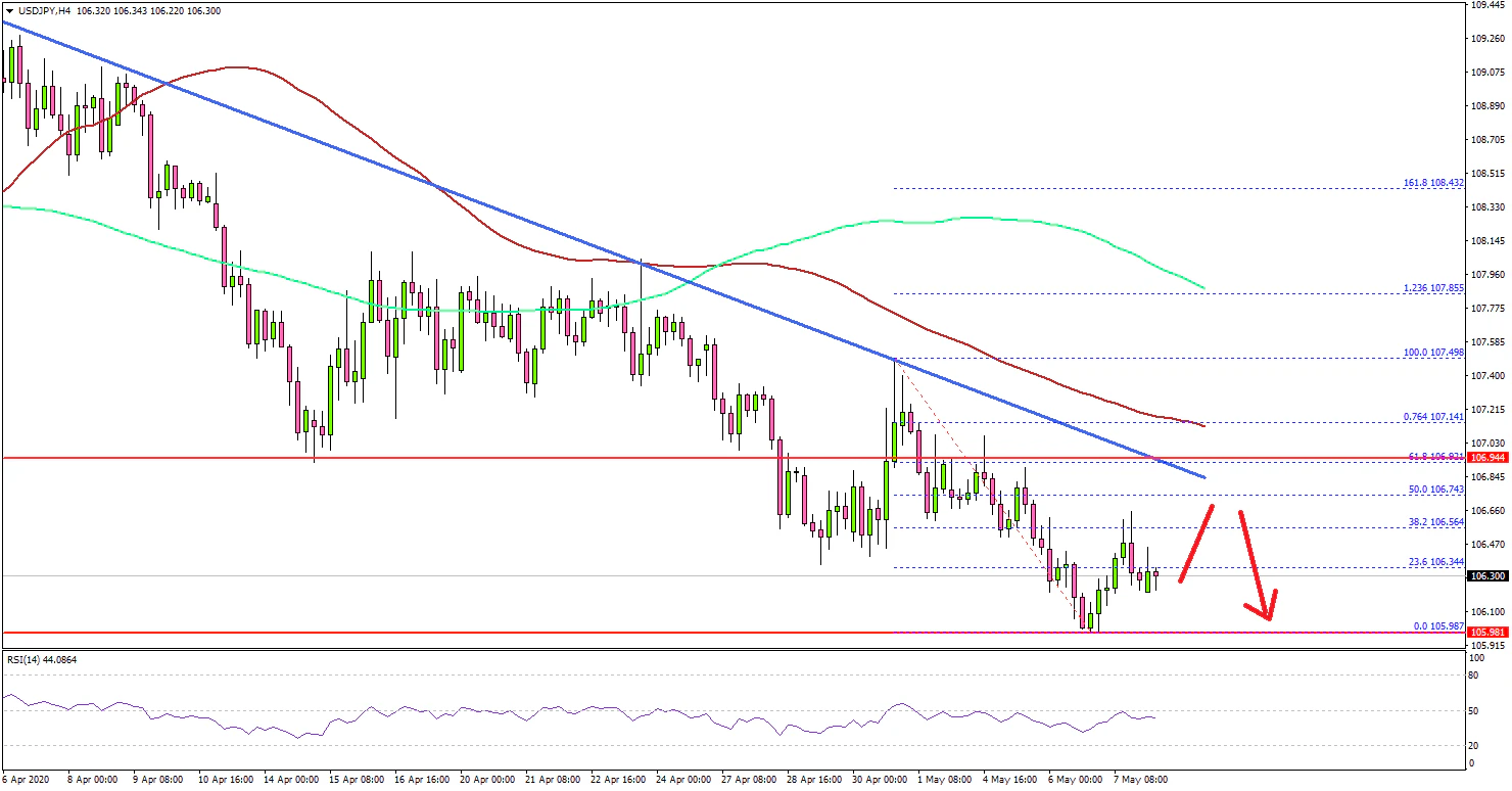 Recently, there was an upside correction from the 105.98 low and the pair recovered above the 38.2% Fib retracement level of the downward move from the 107.49 high to 105.98 low.