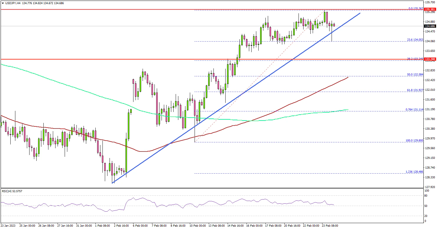 • A connecting bullish trend line is forming with support near 134.50 on the 4-hours chart.