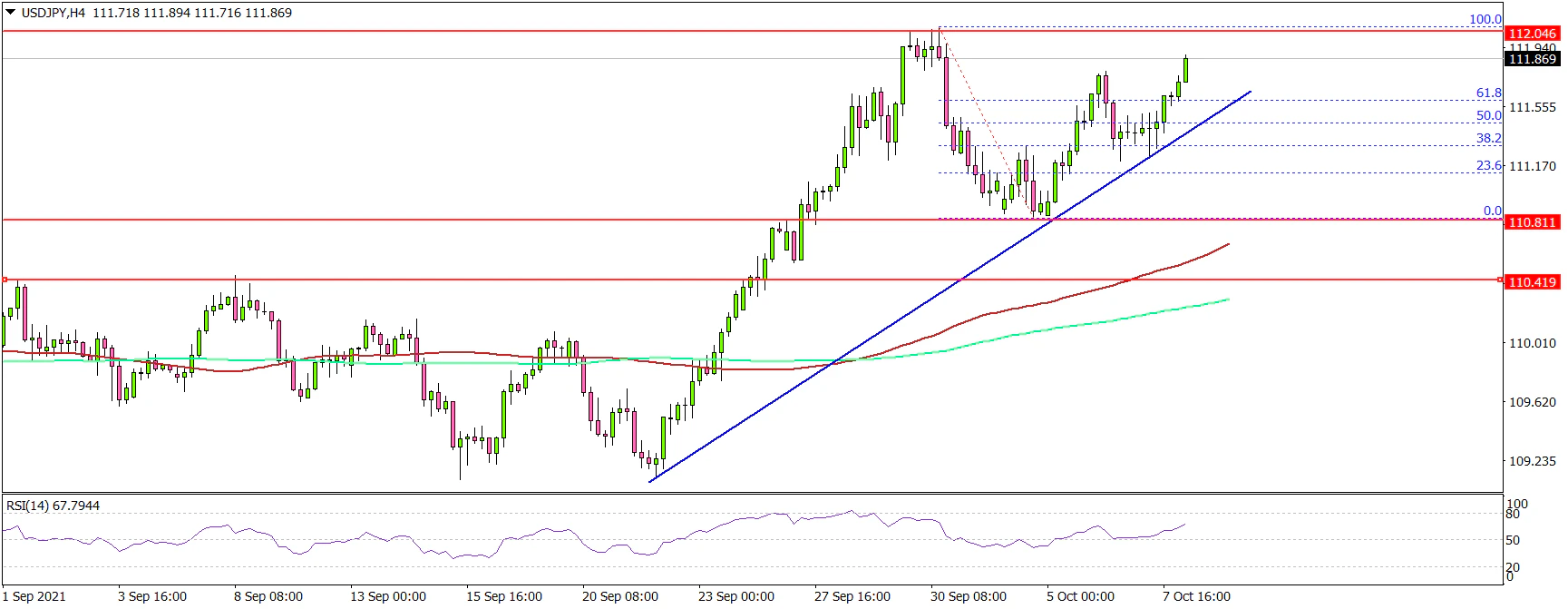 The recent low was formed near 110.81 before it started a fresh increase. The pair is now trading above the 111.50 and 111.60 levels.