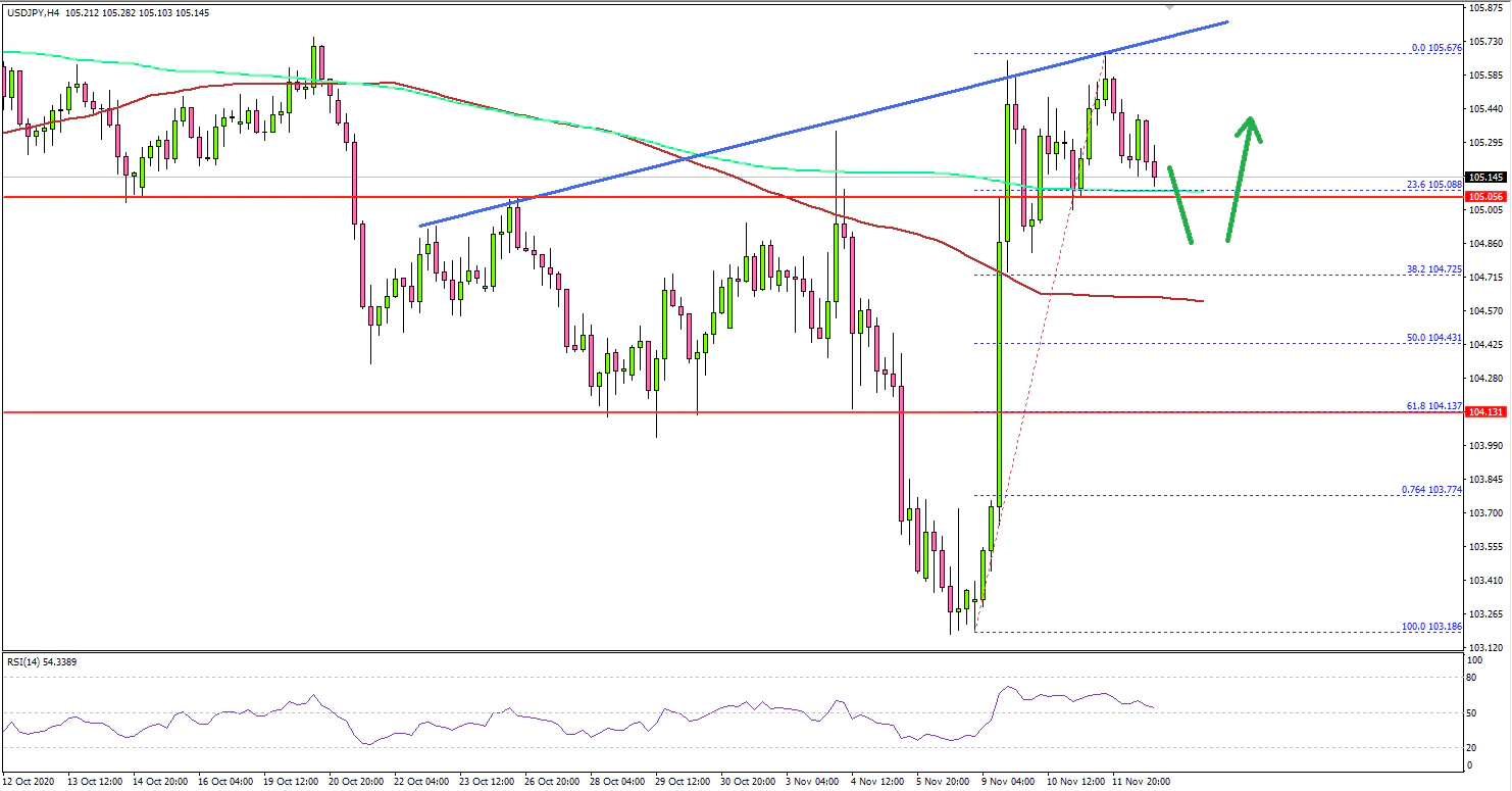 On the downside, the 105.00 level is a decent support. The next major support is near the 104.70 level and the 100 simple moving average (red, 4-hours).