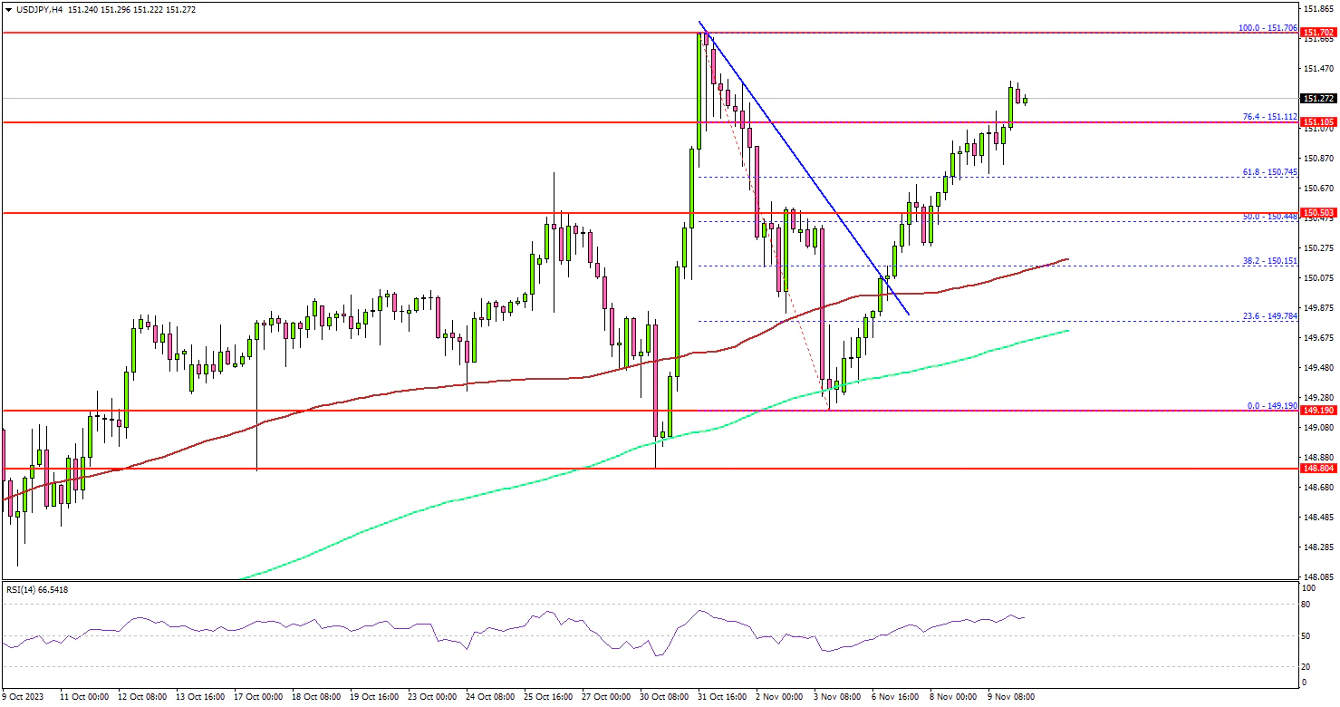 The US Dollar remained strong above the 149.20 level against the Japanese Yen. USD/JPY remained stable and started a fresh increase above the 149.80 resistance.