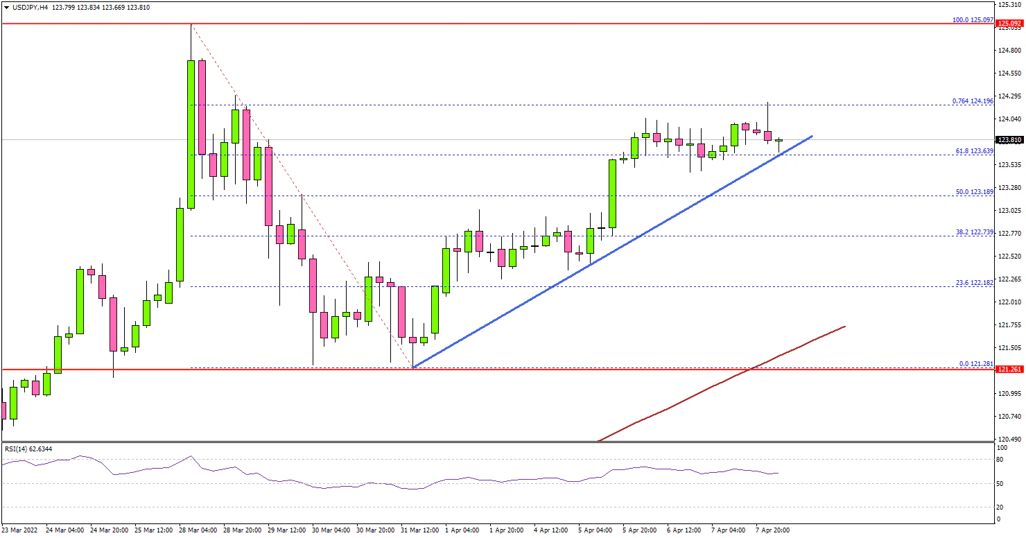 - A key bullish trend line is forming with support near 123.75 on the 4-hours chart.