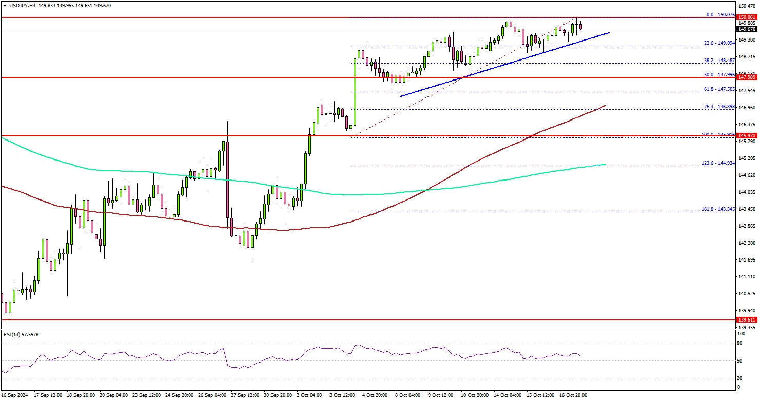 On the downside, immediate support sits near the 149.20 level. There is also a short-term bullish trend line forming with support at 149.25 on the same chart.