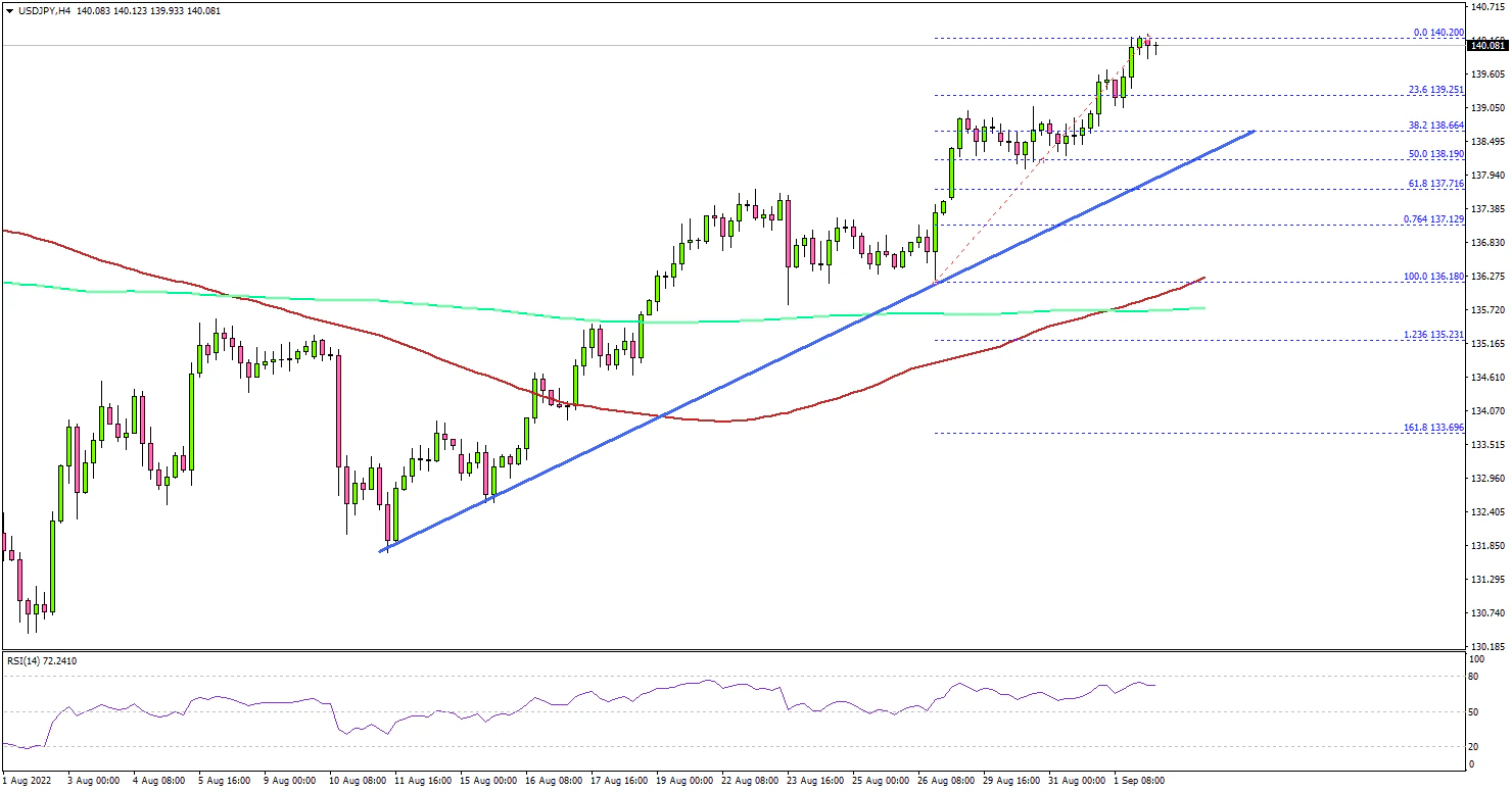 - USD/JPY gained pace and rallied to a new 24-year high above 140.00.