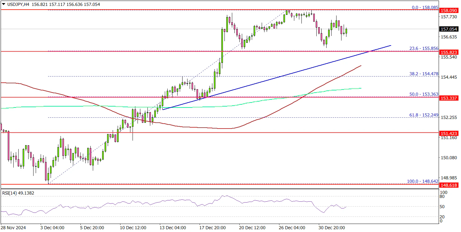 - A key bullish trend line is forming with support at 155.80 on the 4-hour chart.