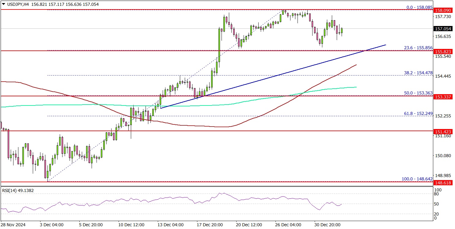 A high was formed at 158.08 before there was a short-term downside correction. The price dipped below the 157.50 level. However, it remained stable above the 23.6% Fib retracement level of the upward move from the 148.64 swing high to the 158.08 high.