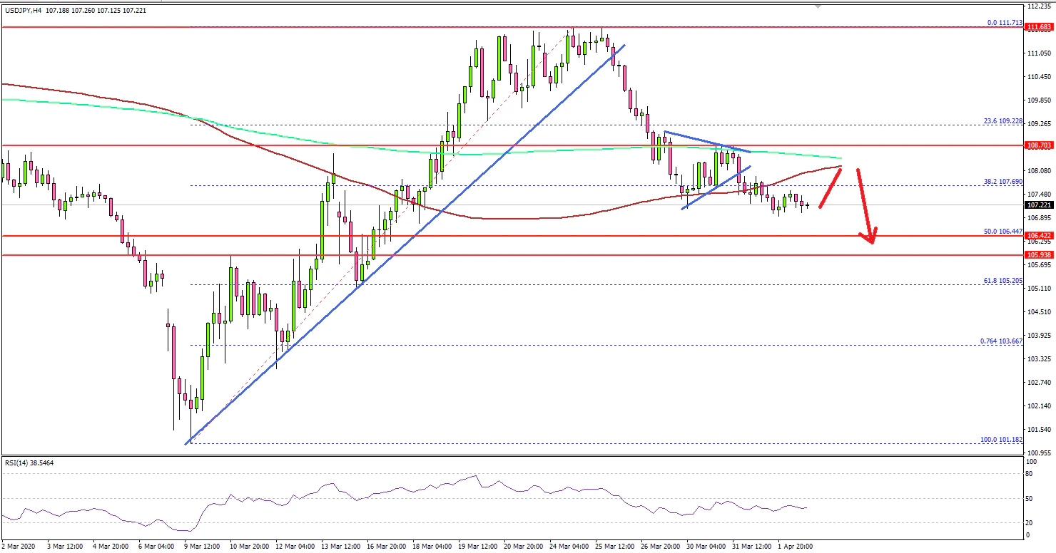 Looking at the 4-hours chart, the pair traded below the 108.00 support level and the 100 simple moving average (red, 4-hours). Besides, there was a break below the 23.6% Fib retracement level of the key upward move from the 101.18 low to 111.71 high.