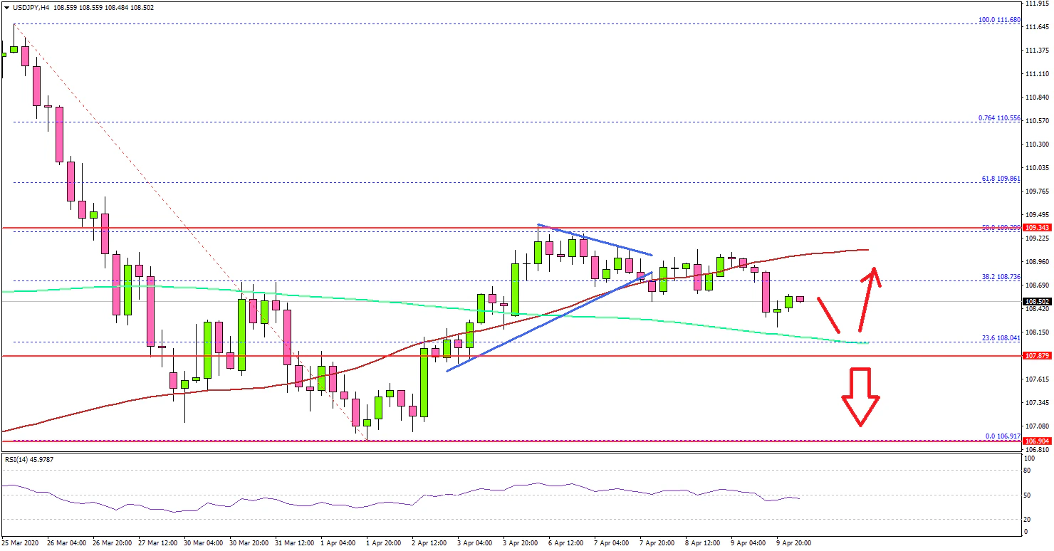 On the downside, there is a key support forming near the 108.00 level and 200 simple moving average (green, 4-hours). If the pair fails to stay above 108.00, it could extend its decline towards the 107.00 and 106.50 support levels.