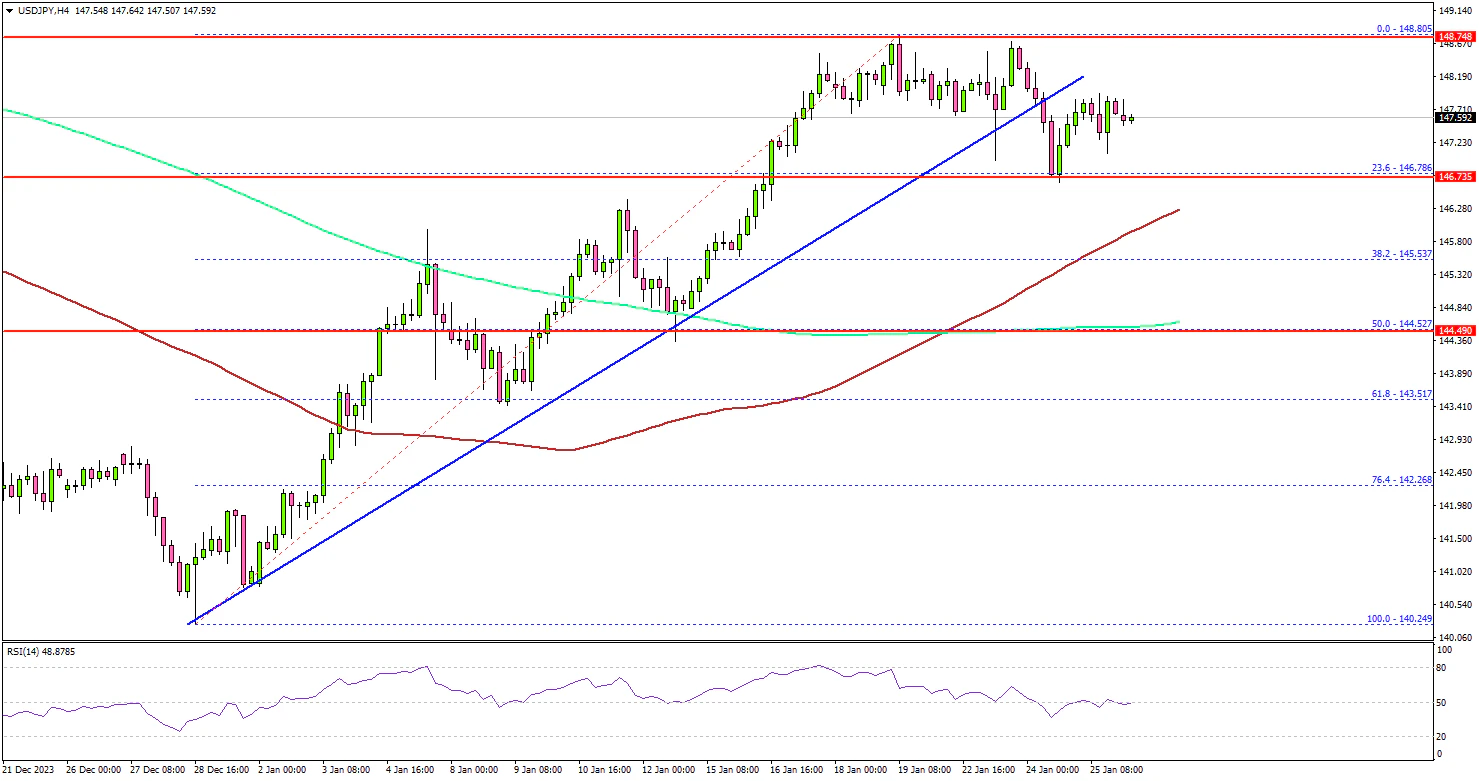 Looking at the 4-hour chart, the pair corrected lower below the 148.00 level. There was a break below a key bullish trend line with support at 147.75. The pair tested the 146.80 support zone and the 23.6% Fib retracement level of the upward move from the 140.24 swing low to the 148.80 high.