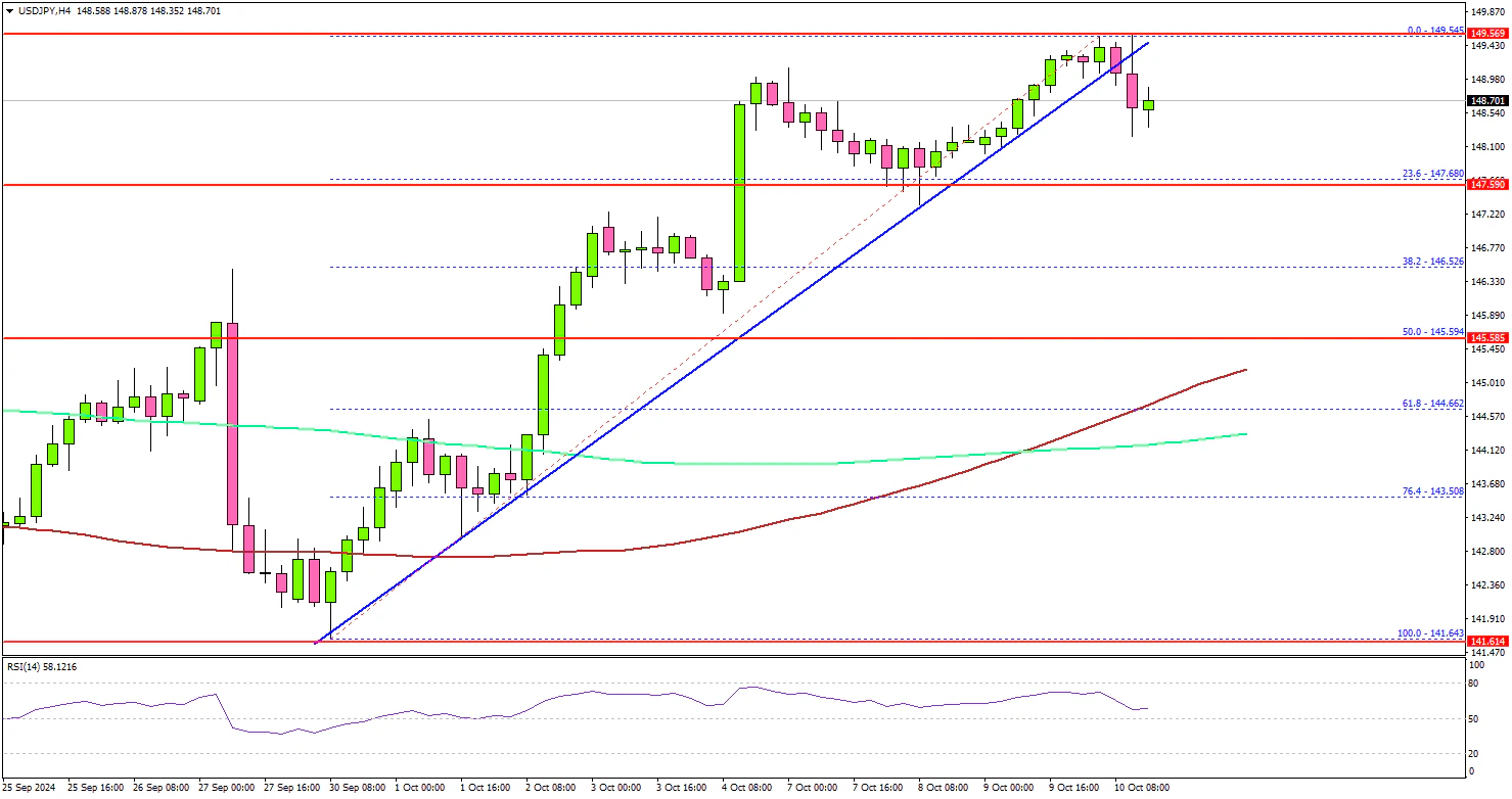The US Dollar gained pace above the 147.50 and 148.50 levels against the Japanese Yen. USD/JPY even surpassed 149.20 before the bears appeared.
