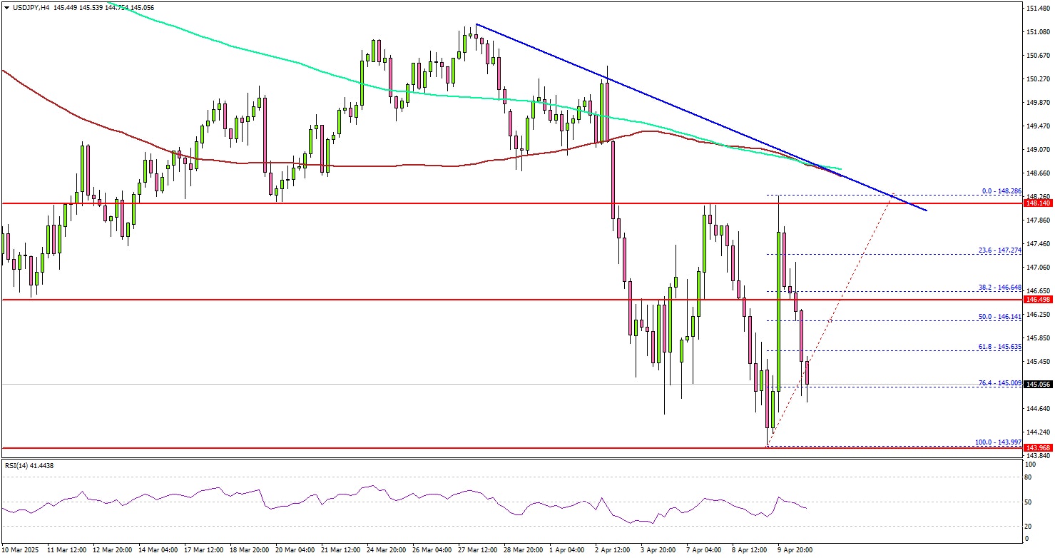 - USD/JPY started a fresh decline below the 146.50 level.