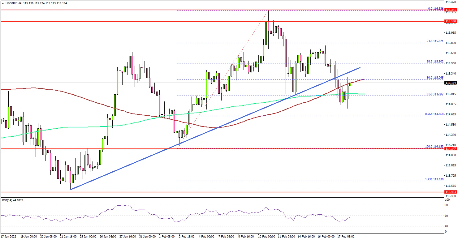 - It traded below a major bullish trend line with support near 115.25 on the 4-hours chart.