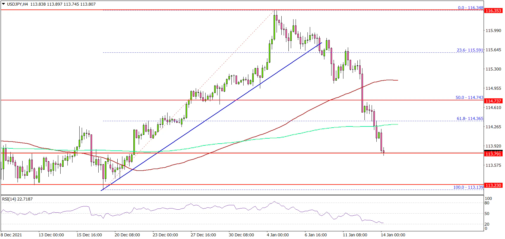 Looking at the 4-hours chart, the pair traded below the key 115.60 support zone. There was a break below a major bullish trend line with support near 115.60 on the same chart.