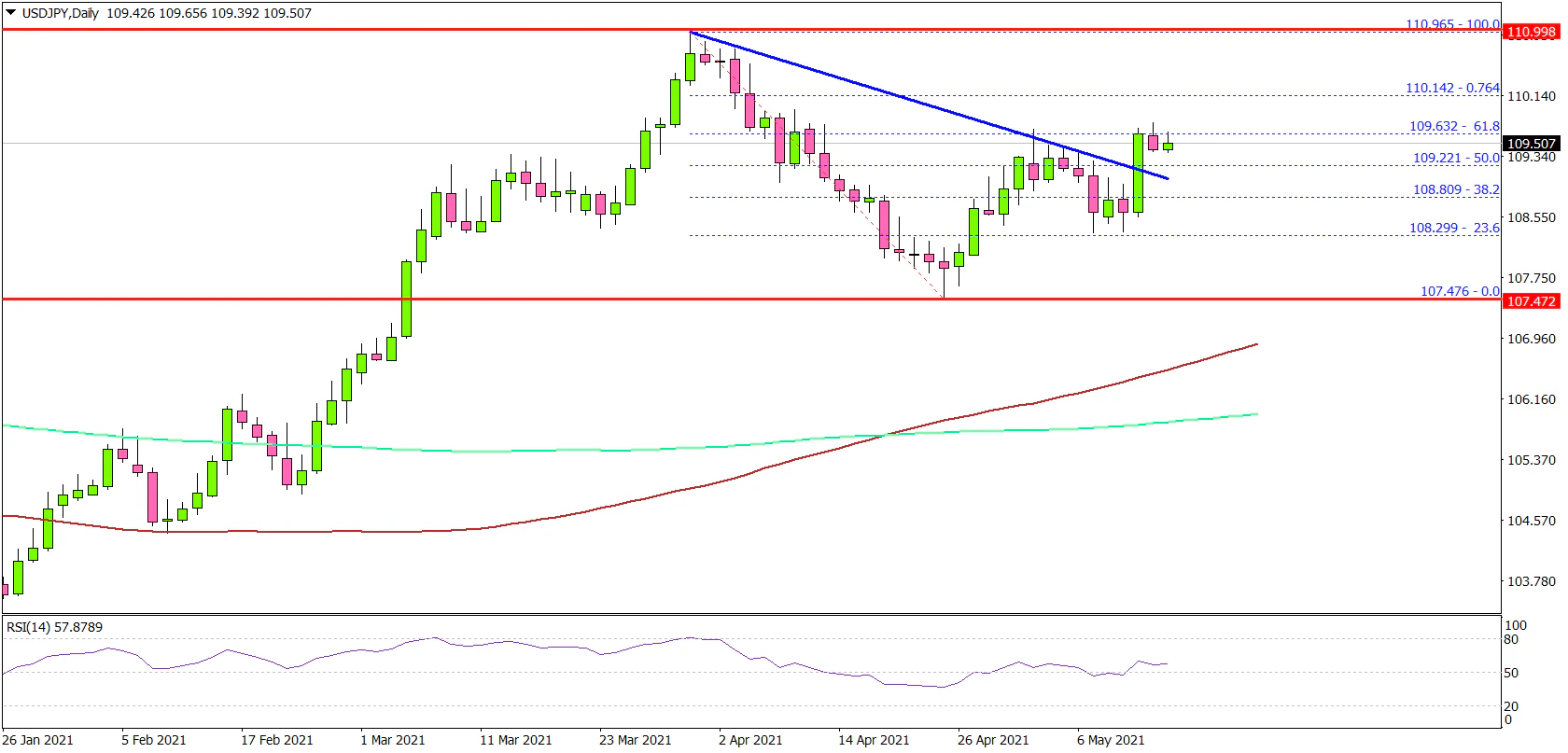 Looking at the daily chart, the pair gained pace above the 109.00 level. It even cleared a major bearish trend line with resistance near 109.10 on the same chart. It is trading well above the 100-day simple moving average (red) and 200-day simple moving average (green).