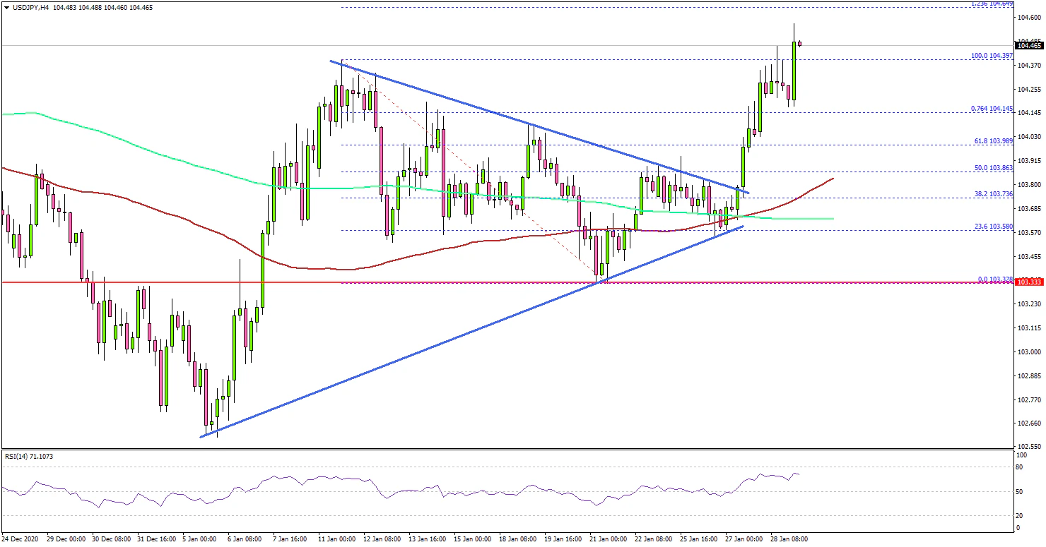 - USD/JPY started a fresh increase above the main 104.00 resistance.
