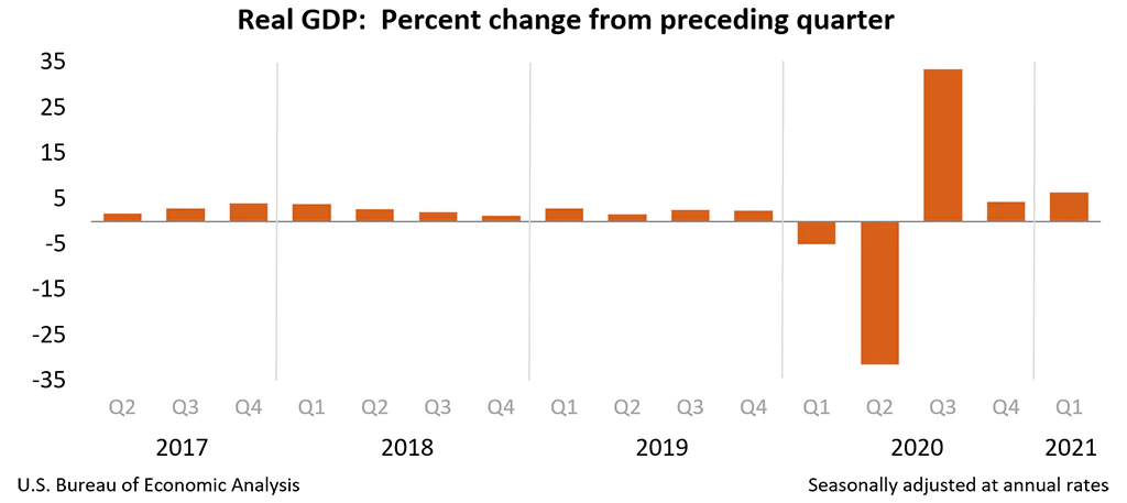- The US GDP grew 6.4% in Q1 2021 (Preliminary), up from 4.3%.