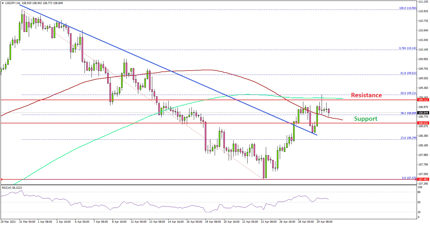 There was also a break above the 108.80 resistance and the 100 simple moving average (red, 4-hours). An immediate resistance is near the 109.20 level and the 200 simple moving average (green, 4-hours).