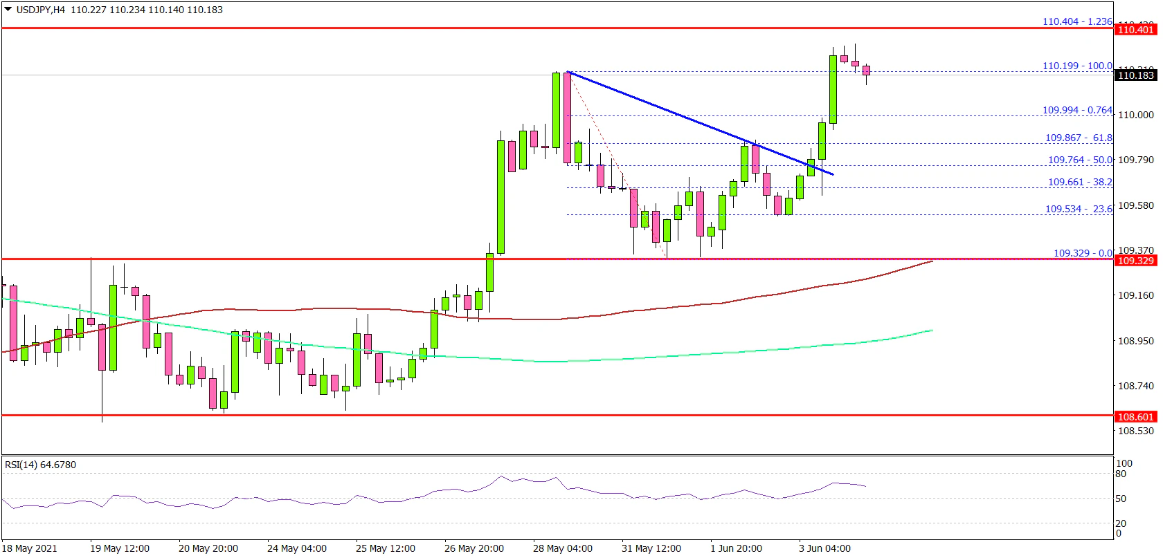 Looking at the 4-hours chart, the pair gained pace above the 109.50 and 109.75 levels. The pair also settled well above the 109.80 level, the 100 simple moving average (red, 4-hours), and the 200 simple moving average (green, 4-hours).