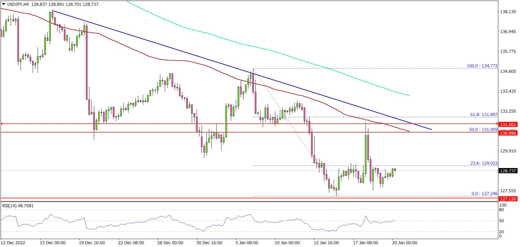 Looking at the 4-hours chart, the pair declined below the 129.20 level. It also settled below the 129.50 level, the 100 simple moving average (red, 4-hours) and the 200 simple moving average (green, 4-hours).