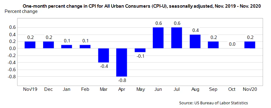 The actual result was better than the market forecast, the US Consumer Price Index increased 1.2% in Nov 2020 (YoY). The monthly change was 0.2%, similar to the market forecast.