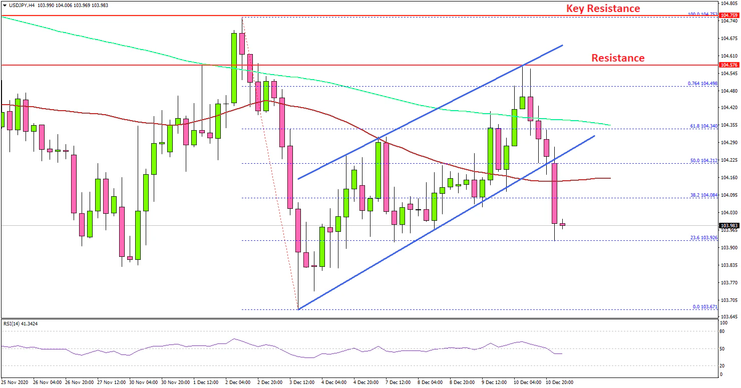 There was a bearish reaction recently, and the pair traded below a key bullish trend line with support at 104.30 on the same chart. The next major support is near the 103.85 level, below which the pair could retest the 103.65 support zone. Any more losses might call for a test of 103.10.