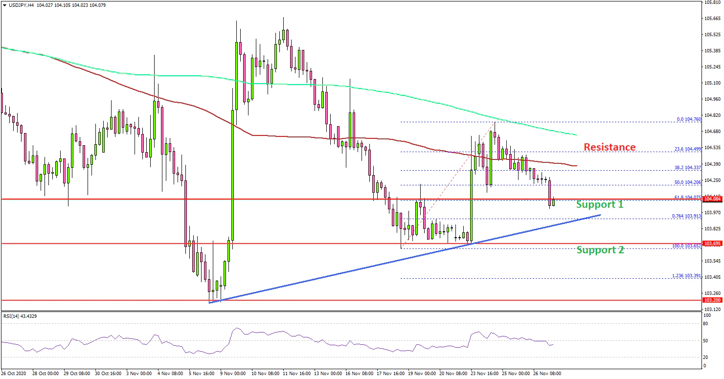 - A major bullish trend line is forming with support near 103.90 on the 4-hours chart.