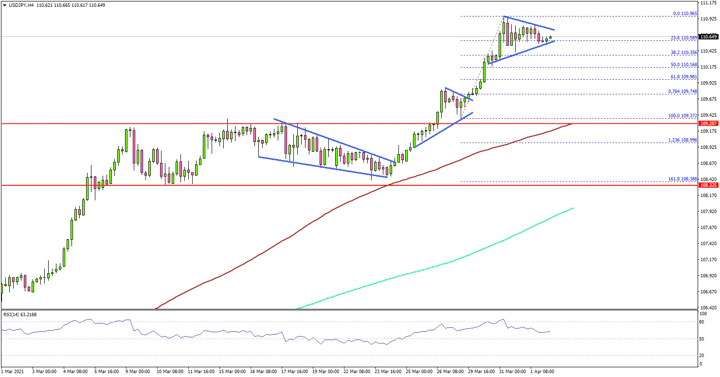 The pair traded to a new multi-week high at 110.96 and it is currently consolidating gains. On the downside, there are many important supports forming near the 110.50 and 110.40 levels.