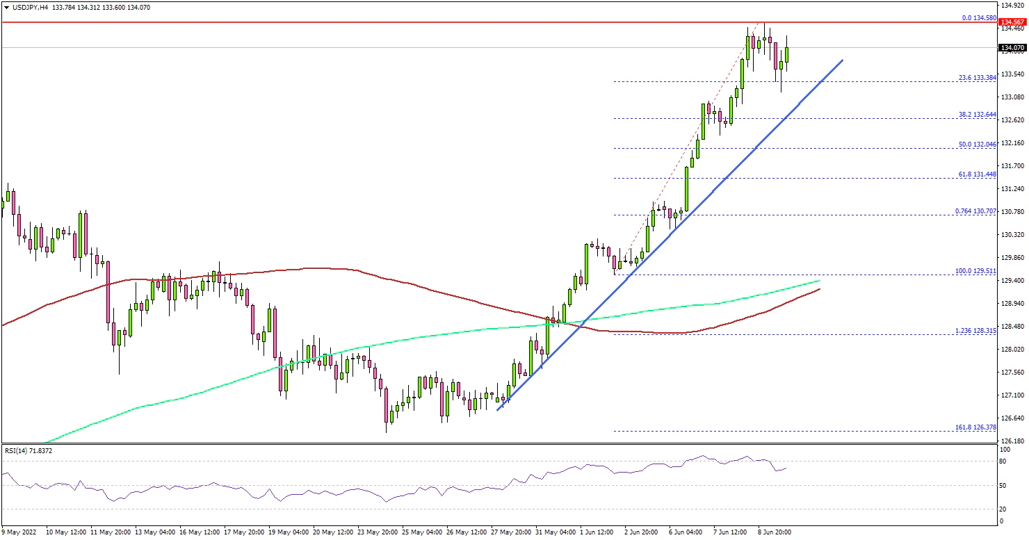 It traded as high as 134.58 and remains supported for more gains. On the downside, there is a decent support near 133.50.