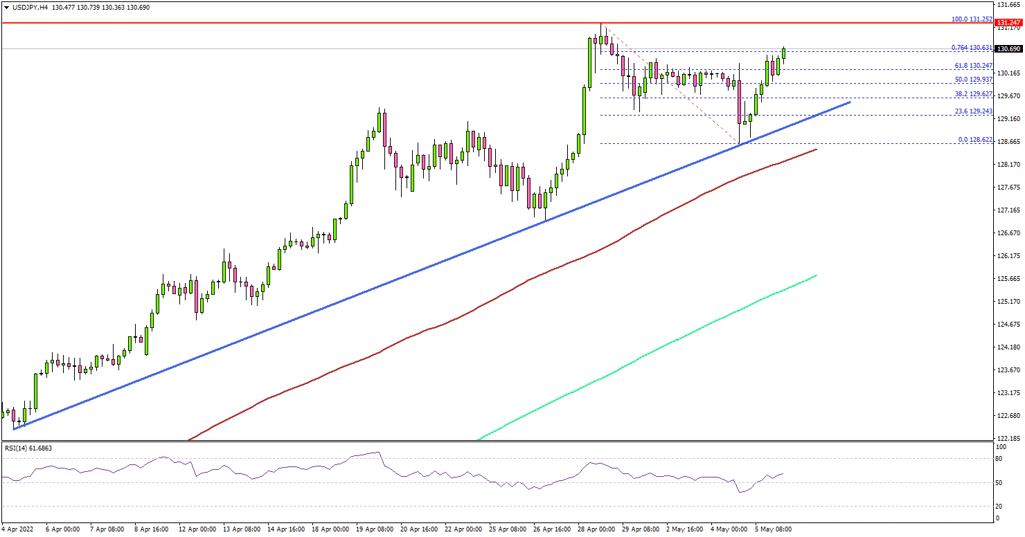 The US Dollar started a downside correction from the 131.25 high against the Japanese Yen. However, USD/JPY remained well bid above 128.50 and started a fresh increase.