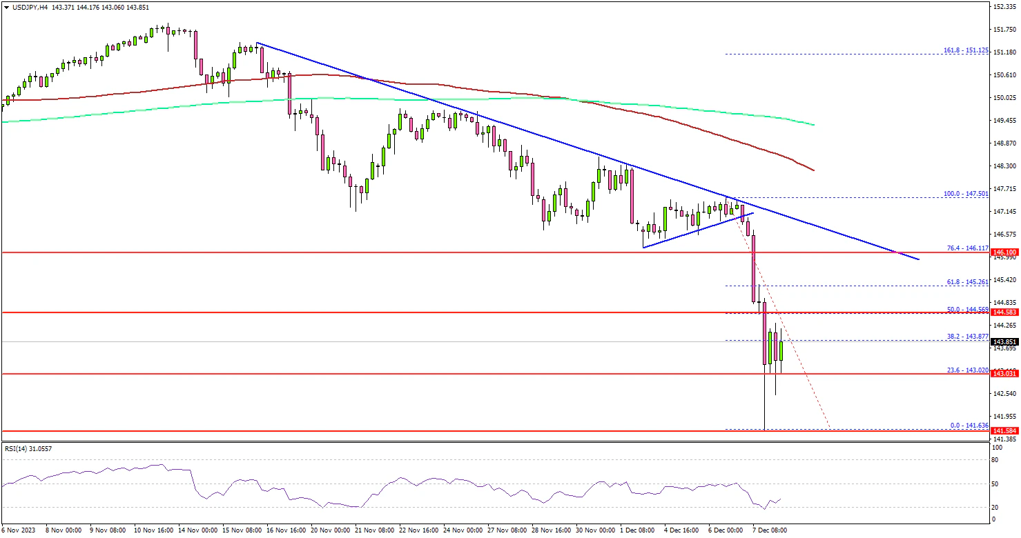 The US Dollar started a major decline from the 150.00 resistance zone against the Japanese Yen. USD/JPY declined below the 148.20 and 147.50 levels to move into a bearish zone.